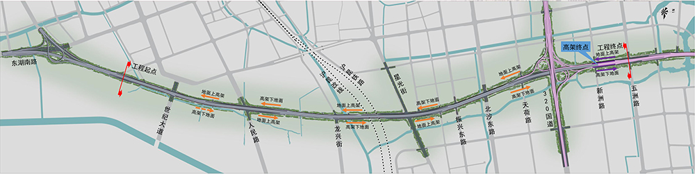 項(xiàng)目起點(diǎn)位于世紀(jì)大道與臨東路交叉口南側(cè),順接?xùn)|湖高架路預(yù)留跳水平臺(tái),沿現(xiàn)狀臨東路與新絲路布置,終點(diǎn)位于新絲路與五洲路交叉口,高架預(yù)留跳水平臺(tái),遠(yuǎn)期規(guī)劃至杭州中環(huán)。項(xiàng)目全長(zhǎng)約5.4公里,采用高架快速路+地面主干道的建設(shè)形式,主線高架和地面道路均采用雙向6車道規(guī)模,主線高架設(shè)計(jì)車速80km/h,高架橋標(biāo)準(zhǔn)寬度為25米,地面道路設(shè)計(jì)車速50km/h,臨東路段地面道路標(biāo)準(zhǔn)寬度42米,新絲路段地面道路標(biāo)準(zhǔn)寬度50米。